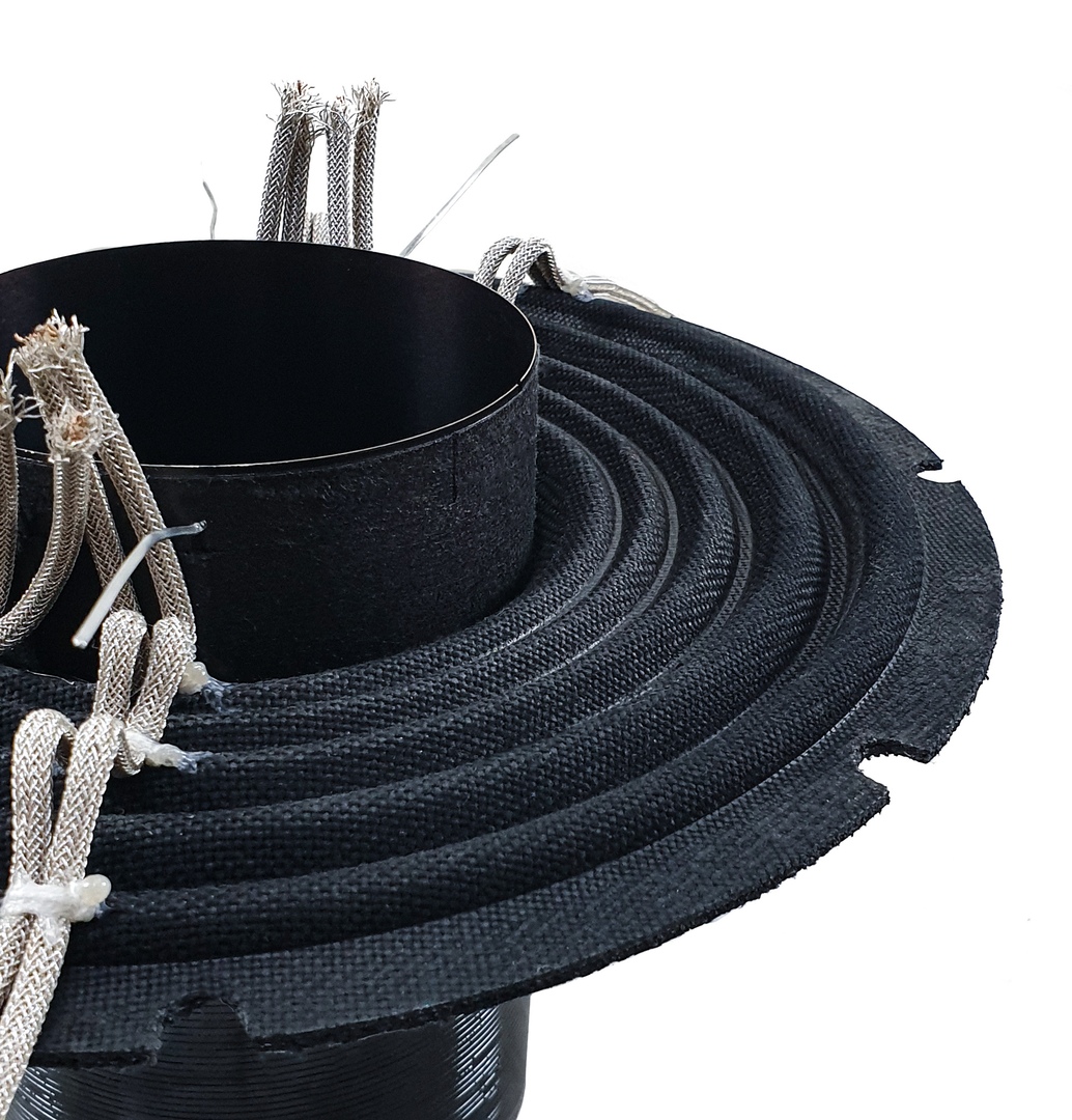 При изготовлении сабвуферов Deaf Bonce мы используем два пакета сдвоенных шайб из одного из лучших типов мета-арамидного волокна - NOMEX, который эффективно переносит высокие температуры, и, вместе с тем, удовлетворяет нашим потребностям в жесткости и эластичности.