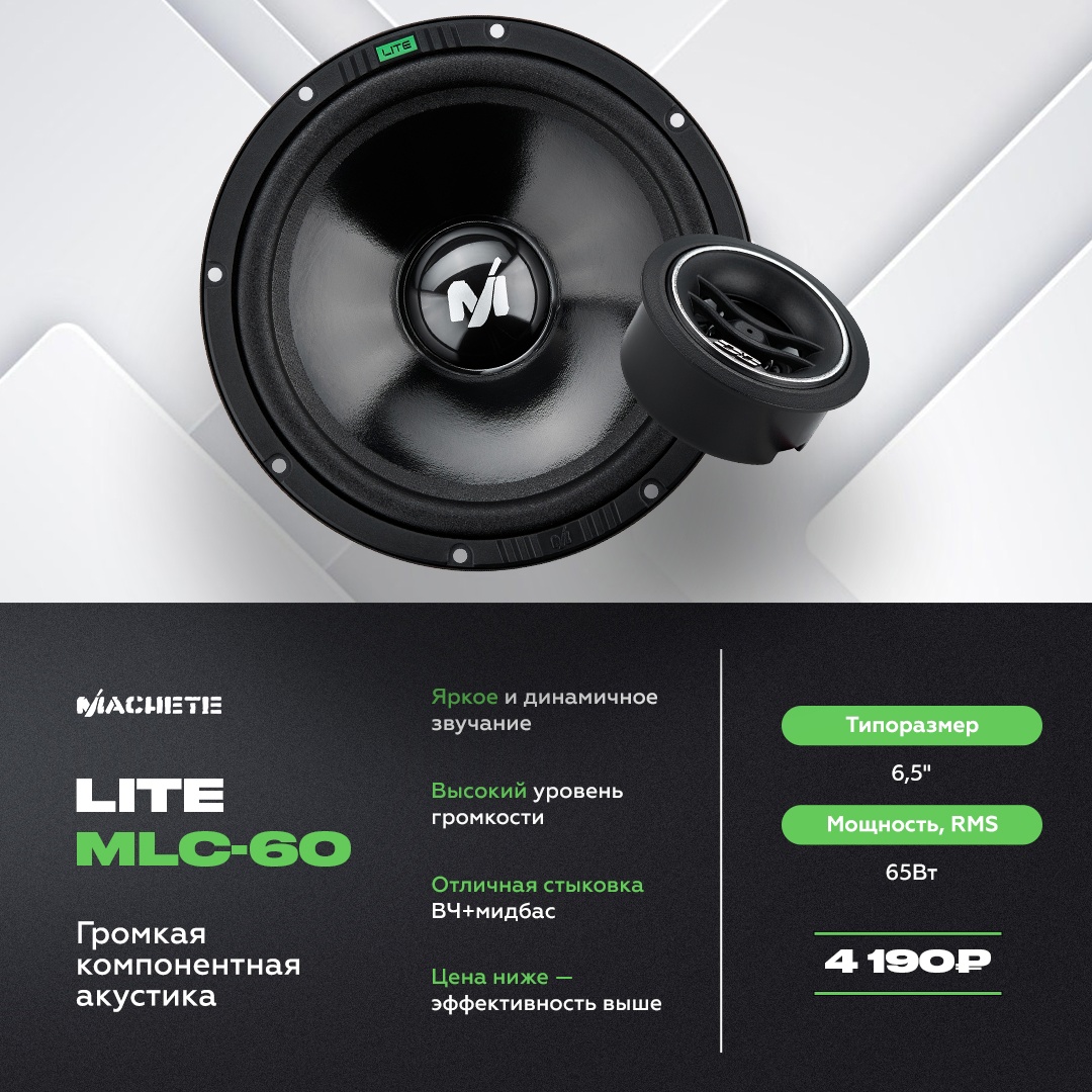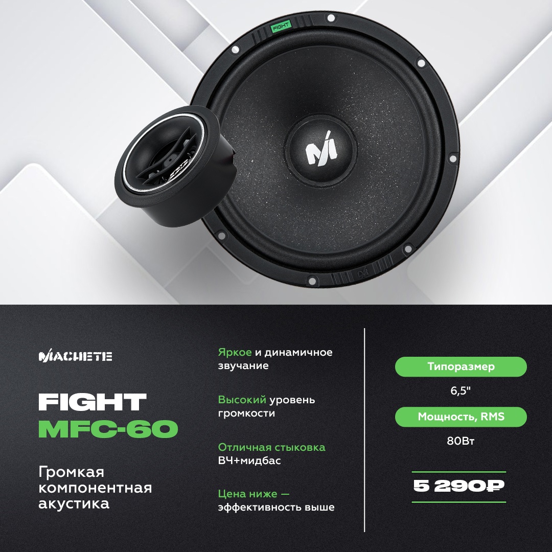 На данный момент, мы готовы выпустить на рынок две модели компонентной акустики в линейках Machete Lite и Machete Fight: MLC-60 и MFC-60, соответственно. И если компонентка Лайт — абсолютно новый продукт, то обновлённые Файты отличаются от своих предшественников MFC-615 компактным, при этом куда более громким и ярким твитером, за счет которого общий уровень звучания на порядок выше.