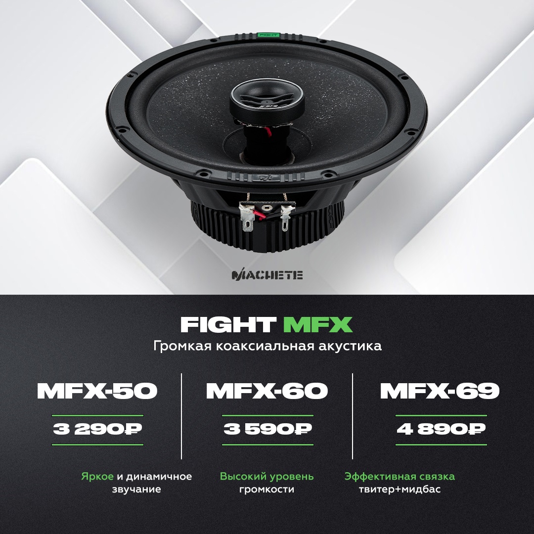 В серии Файт, кроме MFC-60, на рынок также выйдут 3 модели коаксиалов: MFX-50, MFX-60 и MFX-69. Все они построены на базе аналогичных мидбасовых и твиттерных динамиков, обладают схожим приятным характером звучания и высокой громкостью.