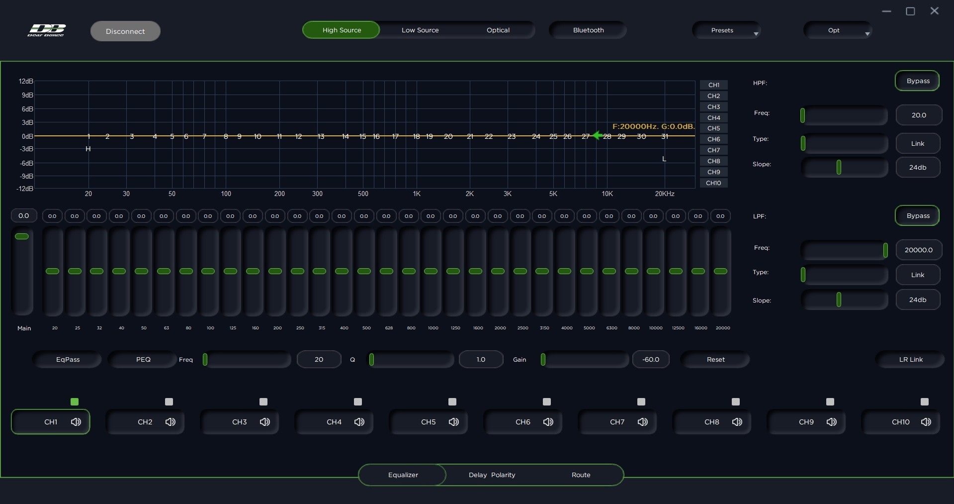 - Широчайшие возможности по настройке: 31 полосный эквалайзер для каждого из каналов, срезы до 6 порядка с возможностью применения типов фильтров Линквиц, Бессель, Баттерворт.