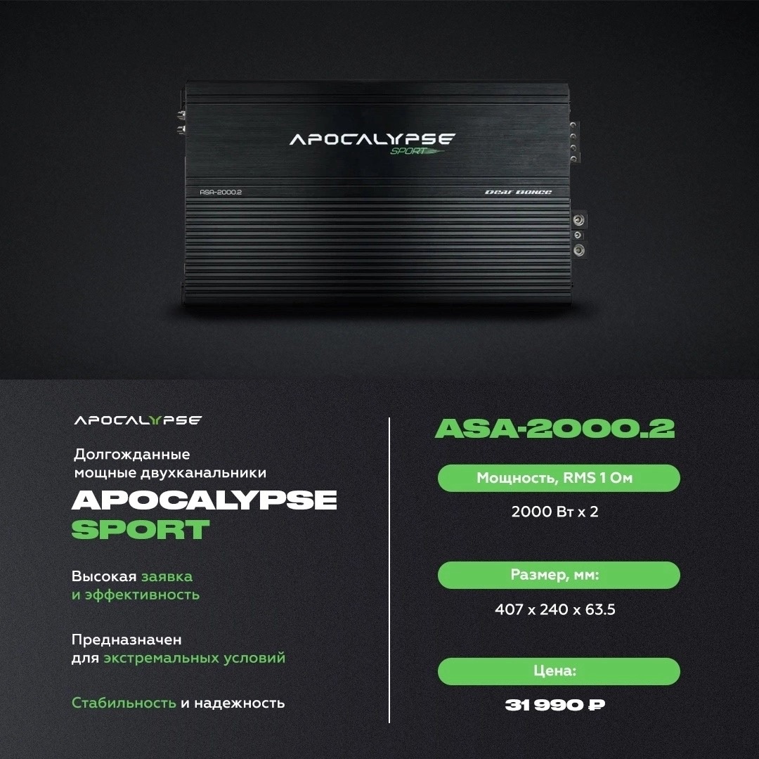 Новинка — более мощная версия двухканального усилителя Apocalypse Sport: 2000Вт в канал чистой мощности, подтвержденной многократными тестами в чуть увеличенном корпусе — по сути, просто чуть более «мускулистый» собрат моделей ASA-1000.2 и ASA-1500.2.